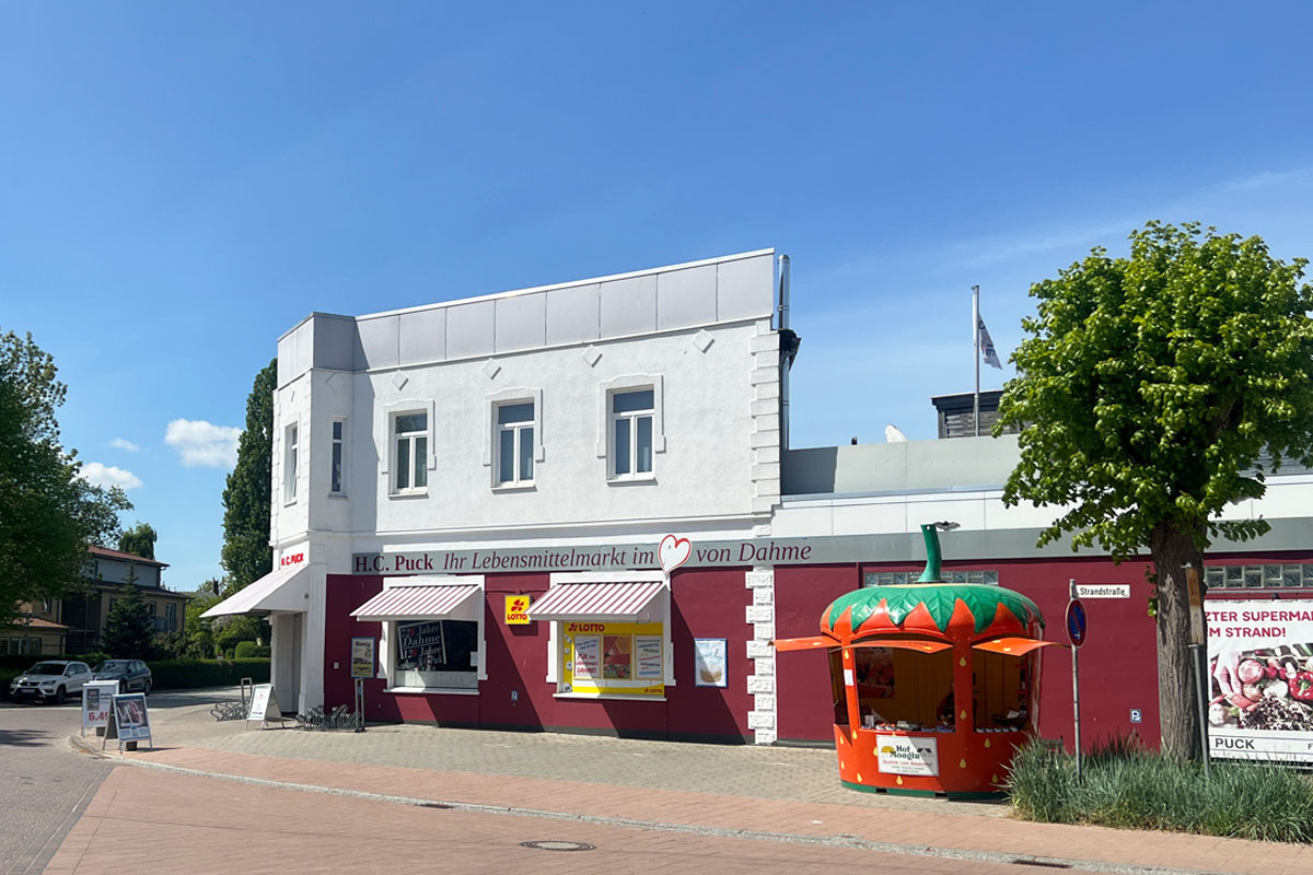 Ihr Lebensmittelmarkt im Herzen von Dahme Ob Haupt- oder Nebensaison, ob Sommer ob Winter, unsere Mitarbeiter und wir sind stets bemüht ein Sortiment zu führen, was Ihren Ansprüchen gerecht wird. Auf 500qm bieten wir Ihnen mit unseren Partnern, PUCK - Mein Ostseebäcker aus Grube und den "Kleinen Fleischer Peters" aus Cismar, ein breites Angebot aus Lebensmitteln, Kleinelektroartikeln, Haushaltswaren, Spielwaren, Strandbedarf, Souvenirs, Zeitschriften, Bücher, Lotto und vieles mehr. Wir freuen uns auf Ihren Besuch!