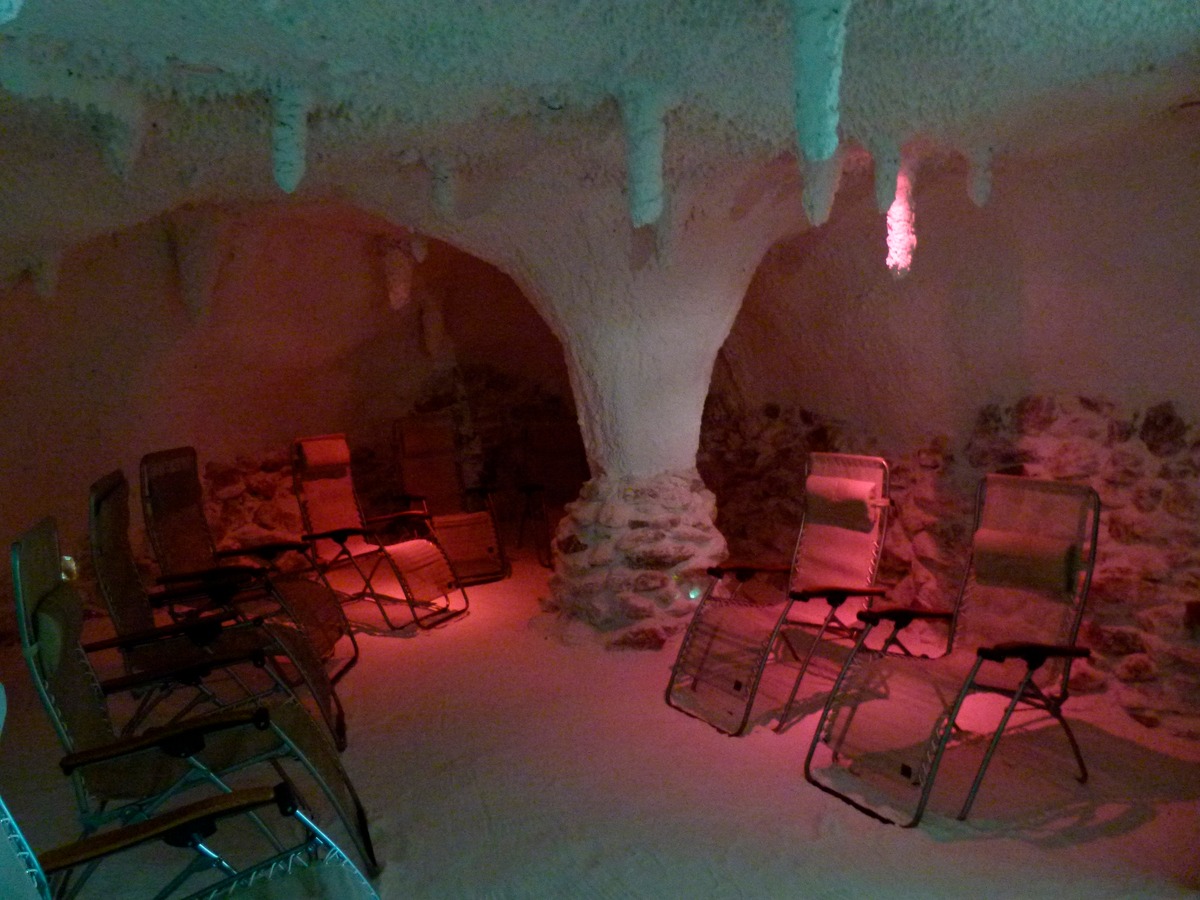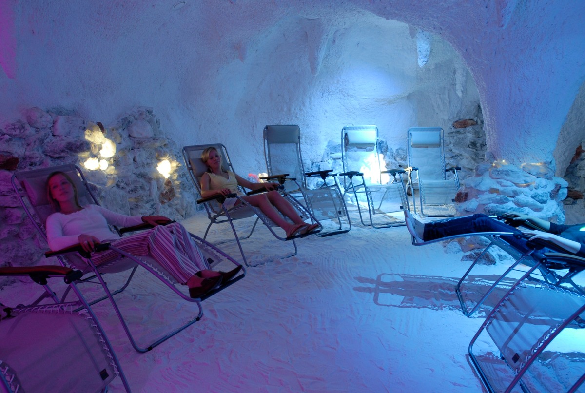 Durchatmen, Wohlfühlen, Heilen. Durch den mit 24 Tonnen Salz ausgestatteten Raum wird eine Ionisierung der Luft erreicht, die in Kombination mit dem erhöhten Salzgehalt der Luft eine positive Wirkung auf Atemwegserkrankungen hat. Selbst zur Entlastung von Herzerkrankungen wird positiv Einfluss genommen.